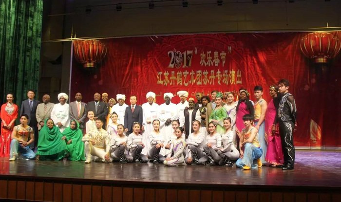 2月22日晚,由中國文化部委派的江蘇鹽城藝術(shù)團(tuán)“歡樂春節(jié)”訪問蘇丹的首場演出在蘇丹首都喀土穆友誼廳隆重舉行。中國駐蘇丹大使李連和、蘇丹總統(tǒng)助理、蘇丹發(fā)展對華關(guān)系委員會副主席賈茲、蘇丹文化部部長塔伊布•哈桑•巴達(dá)維、內(nèi)閣事務(wù)部長艾哈邁德•薩阿德•奧馬爾、文化部國務(wù)部長哈倫•歐麥爾、文化部次長卡拉姆拉、華僑代表等中蘇嘉賓近千人出席。 李連和大使首先向現(xiàn)場嘉賓和僑胞致以新春的祝福和問候,并熱烈歡迎鹽城藝術(shù)團(tuán)來蘇訪問演出。李大使在致辭中高度評價“歡樂春節(jié)”活動,表示此次蘇丹訪演活動必將進(jìn)一步加強(qiáng)中蘇人文和地方交流,推動中蘇面向未來的全面友好合作伙伴關(guān)系向前發(fā)展。 賈茲助理、塔伊布•哈桑•巴達(dá)維部長在致辭中分別表示,中蘇關(guān)系堅固,中蘇友誼悠久,并不斷快速發(fā)展,造福兩國人民。中方在很多領(lǐng)域給予蘇丹指導(dǎo)和幫助,兩國在文化方面的交流日益頻繁。觀眾們對此次鹽城藝術(shù)團(tuán)的演出更是充滿期待,相信這將進(jìn)一步深化雙邊文化交流,加深兩國人民的感情。 演出在歡快喜慶的中國傳統(tǒng)雜技《登鼓》中拉開帷幕,雜技、舞蹈等節(jié)目依次登臺:《滾燈》、《轉(zhuǎn)碟》、《空竹》等展示了中國傳統(tǒng)雜技的風(fēng)彩,舞蹈《傣家姑娘》、《天山雪蓮》舞出了東方的曼妙神韻,驚險雜技《高車踢碗》、《球技》令人嘆為觀止。蘇丹國家民族藝術(shù)團(tuán)也帶來了充滿非洲風(fēng)情的南科爾多凡和卡薩拉舞蹈。演出現(xiàn)場高潮迭起,亮點不斷,受到了觀眾熱烈歡迎,掌聲經(jīng)久不息,蘇丹孔子學(xué)院的學(xué)生們多次發(fā)出“我愛你,中國”的歡呼聲。中國新華社、蘇丹東方碼頭電視臺、青尼羅河電視臺等媒體對演出進(jìn)行專題報道。 演出結(jié)束后,賈茲助理等一行在李連和大使的陪同下走上舞臺同演員們親切握手,與鹽城藝術(shù)團(tuán)顏金泉團(tuán)長親切交流,祝賀演出成功,感謝藝術(shù)團(tuán)的精彩演出,并同演員們合影留念。 江蘇鹽城藝術(shù)團(tuán)還將于23日晚在喀土穆友誼廳舉辦第二場演出,25日參加世界人民友好大游行文藝活動。