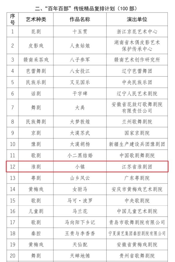 11月2日,在文化和旅游部召開的全國藝術(shù)創(chuàng)作工作會議上,公布了慶祝中國共產(chǎn)黨成立100周年舞臺藝術(shù)精品創(chuàng)作工程重點扶持作品名單,由鹽城市演藝集團出品的淮劇《小鎮(zhèn)》入選“百年百部”傳統(tǒng)精品復(fù)排計劃。